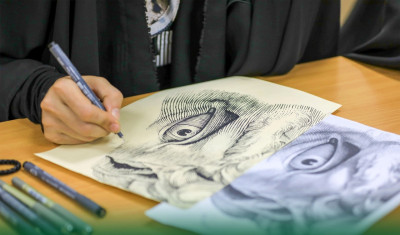 Mr. Ali Zaki Al-Tamimi, Head of the Department, said that “this course is part of the department’s art programs designed to develop the creative talents of girls interested in fine arts and to refine their skills in ink drawing, one of the most significant forms of visual expression that blends precision, beauty, and imagination.”