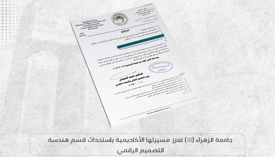 ويعكس استحداث قسم هندسة التصميم الرقمي في جامعة الزهراء (عليها السلام) للبنات حرص الجامعة على تطوير التعليم الهندسي والرقمي، وتأهيل الطالبات لاكتساب المهارات العملية والمشاركة الفاعلة في المشاريع التقنية والإبداعية محليا ودوليا تحت رعاية العتبة الحسينية المقدسة.